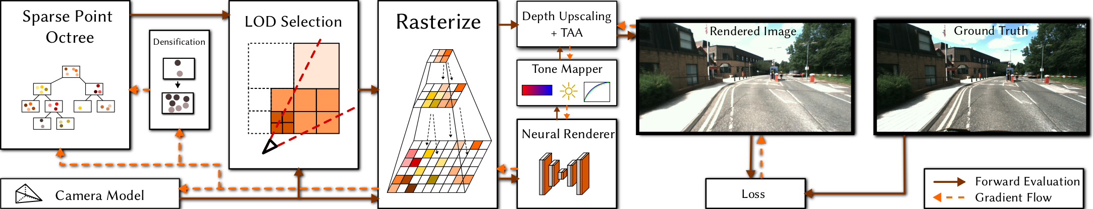 Figure 1: We preprocess our unstructured point cloud to an octree. For rendering and optimization, we cut the octree based on level of detail (LOD) considerations and rasterize into multi-resolution feature images with progressively lower resolutions. A neural renderer and subsequent tone mapper resolve and combine the image pyramid. Following a temporal anti-aliasing module smooths the rendering. During training, all points as well as camera and tone mapping parameters are optimized, and the octree cells are further densified and pruned.